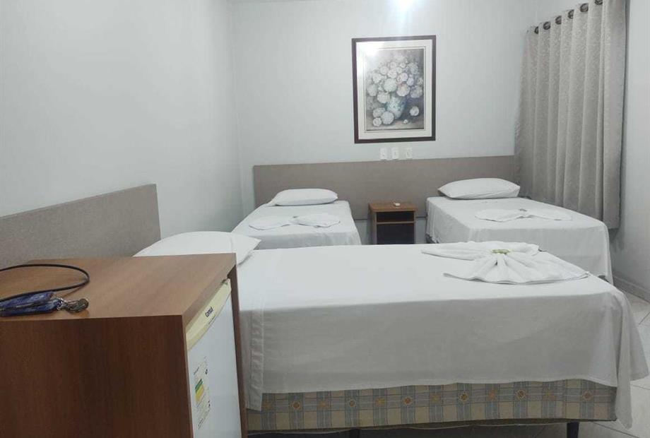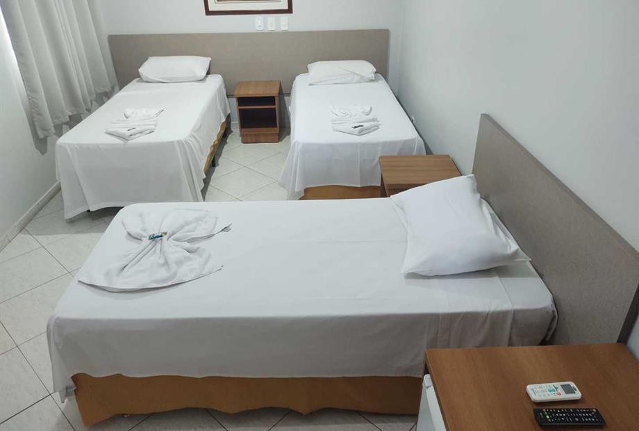 Quarto com 03 Camas de Solteiro, o quarto possui banheiro privativo, TV, Ar condicionado e Frigobar